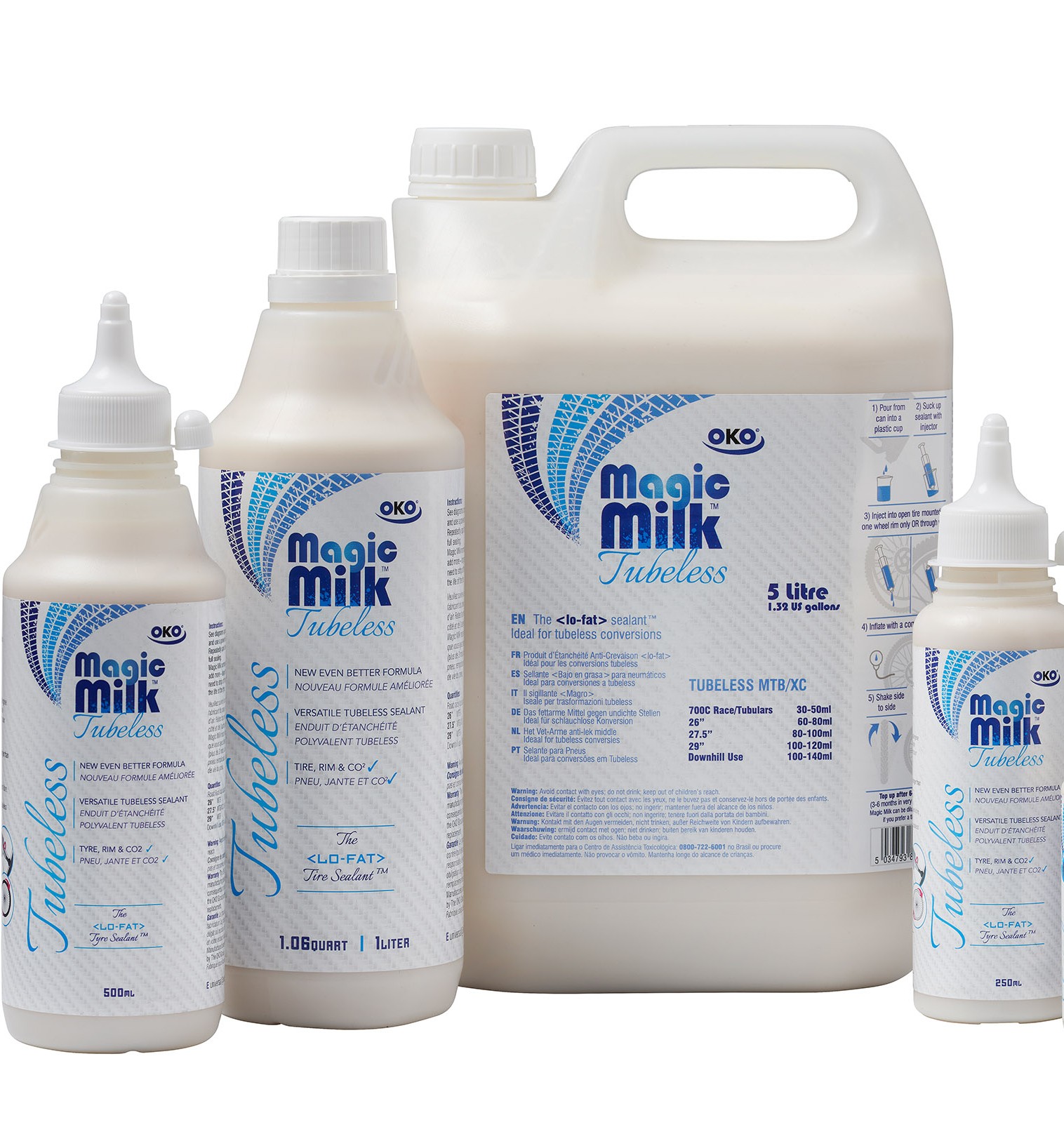 OKO Magic Milk 100% lattice sintetico, il più indicato poiché sigilla rapidamente i copertoni in combinazione con il montaggio tubeless ready. La sua fluidità è garantita grazie all`eccezionale composizione la quale permette al liquido di estendersi rapidamente su tutte le parti interne del copertone e cerchio. OKO Magic Milk è probabilmente il più indicato per uso generico ed è ottimo per essere abbinato al PTN. |